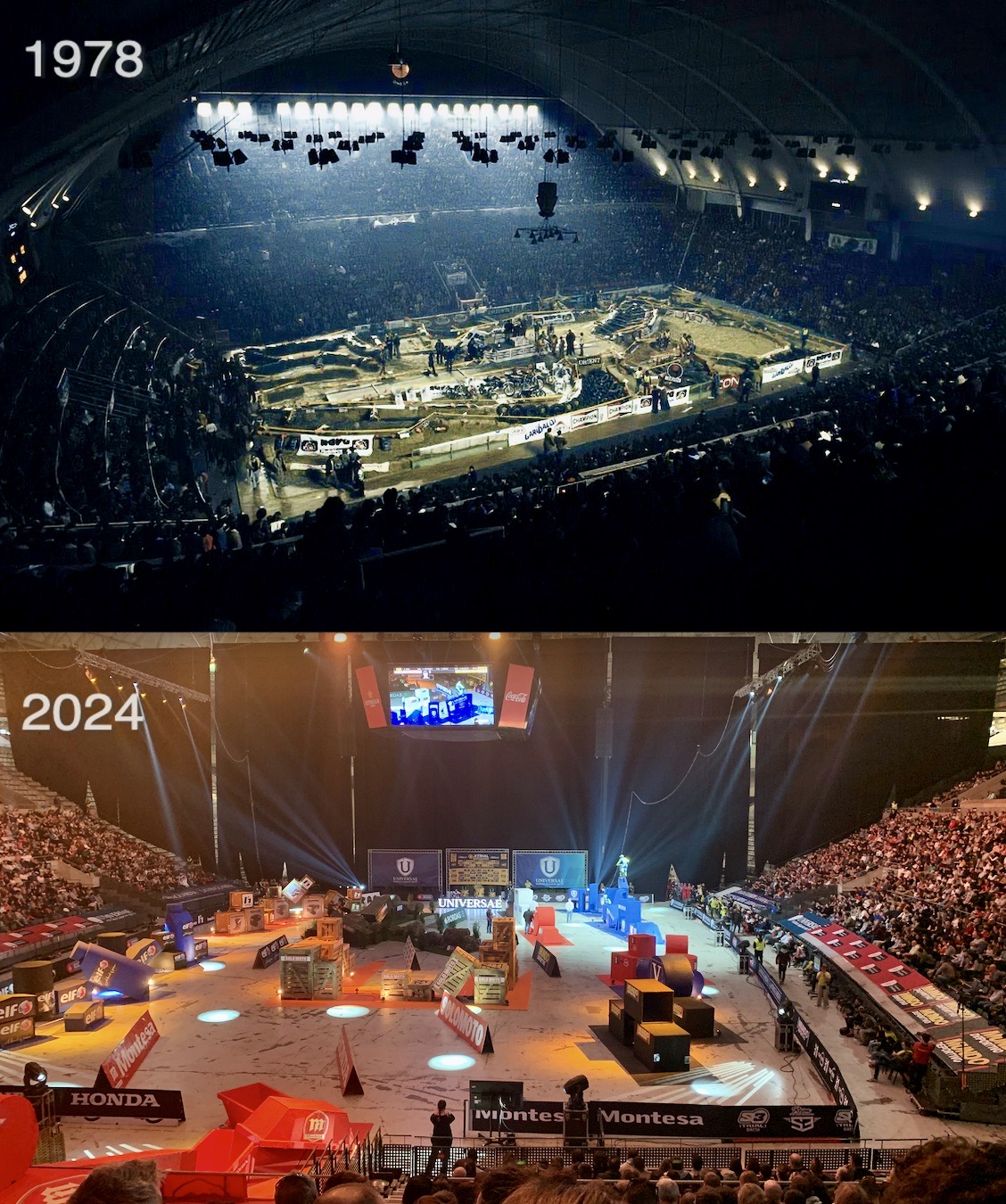 431.- Aquestes dues fotos que presento per fer aquesta crònica tenen 46 anys de diferència. La primera correspond al primer Trial Indoor Solo Moto que es va celebrar a l’enyorat Palau d’Esports de Barcelona. La segona és de l’últim Trial Indoor Solo Moto a l’espectacular Palau Sant Jordi, també de Barcelona.