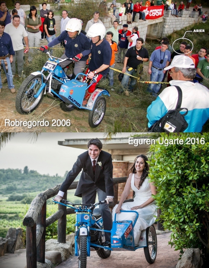 Robregordo 2006: de vegades ens esforcem a comentar tots els moments bons i dolents que ens dóna la vida, però no els inesperats. Un jove (i per a nosaltres aleshores desconegut) Asier, al costat dels seus amics, està contemplant el pas d’en Mayo i en Piu damunt d’un side-trial. Qui li havia de dir a l’Asier, i a nosaltres que també estàvem allà, que 10 anys més tard l’Asier pilotaria aquest mateix side-trial, vestit de jaqué, per entrar junt amb la nostra filla Marta a la festa de celebració el dia del seu casament; i qui ens hauria de dir a tots que aquest mateix side-trial, 14 anys més tard, formaria part de les nostres motos i records. Us ho explico…