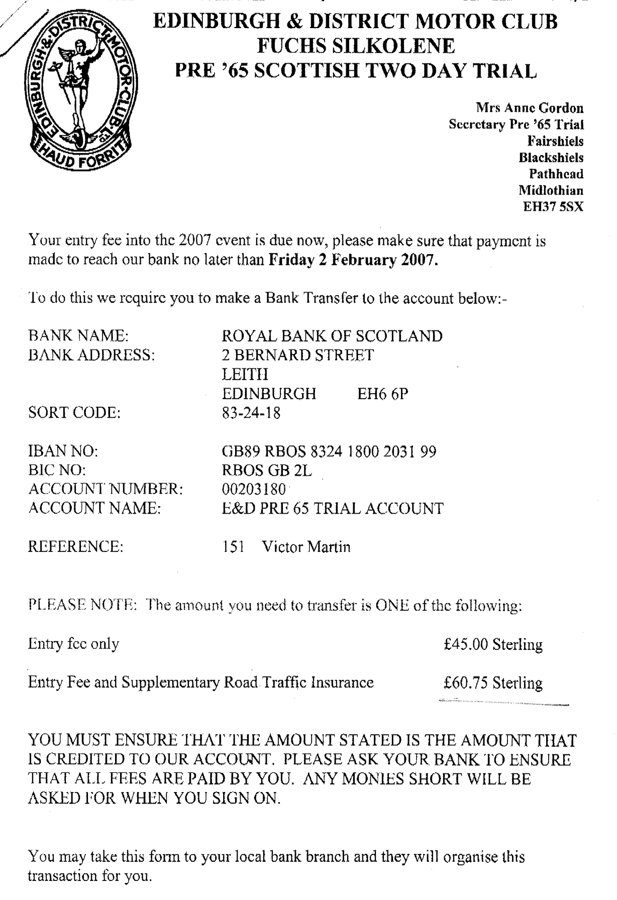 El se encargará de tramitarme la inscripción antes del 15 de diciembre de 2006 para la edición 2007 de los Pre’65 Two Days Scottish Trial a celebrar los días 4 y 5 de mayo.