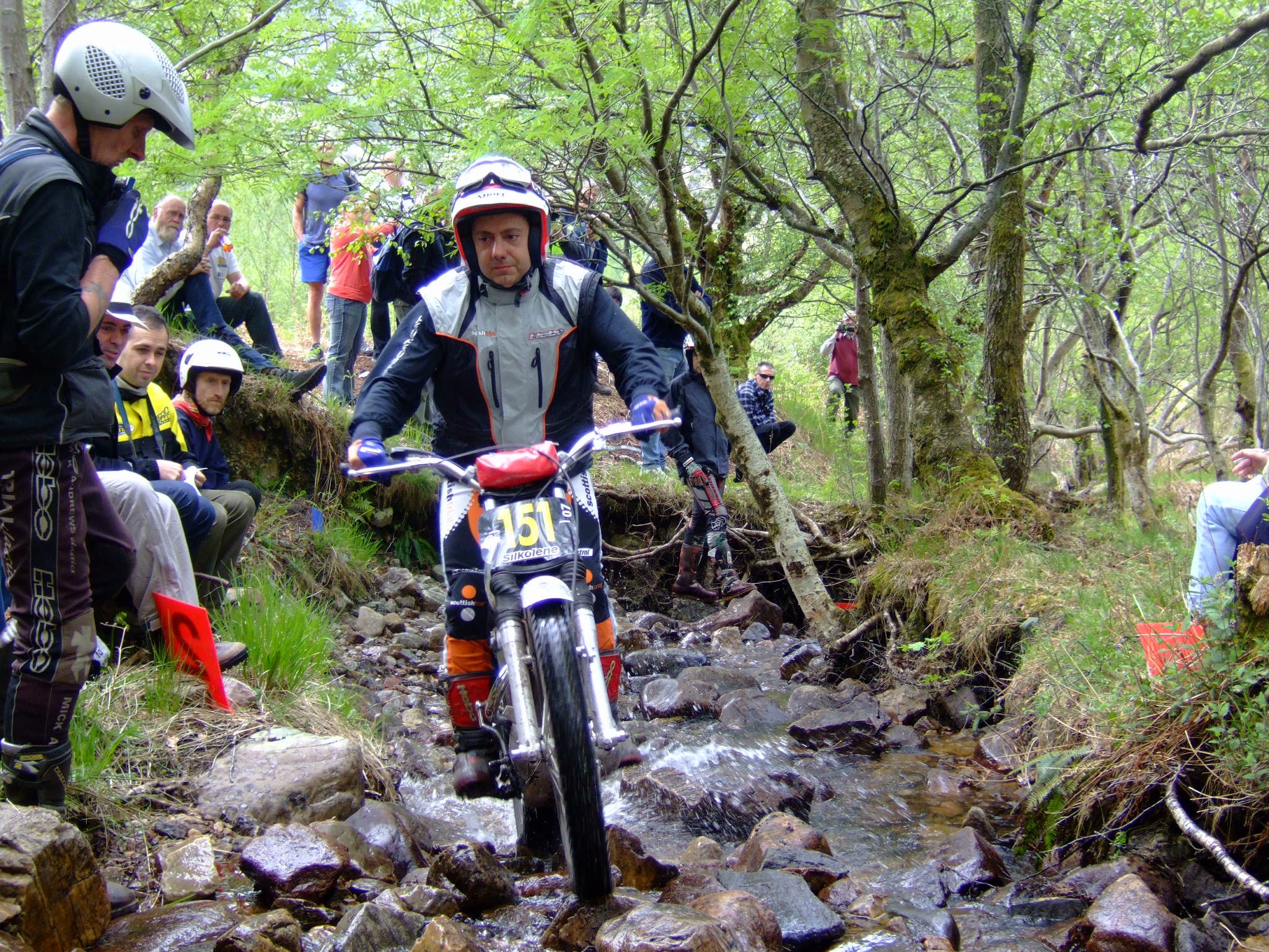 El depósito de la BSA está totalmente reparado y hoy, con un día nublado y más “scottish” nos disponemos a afrontar los 16 grupos con 30 zonas. Los parajes son espectaculares, las zonas no lo son menos, agua, piedras, más piedras, arroyos, losas, cascadas, blackwaters, amigos, trial… se me hace otra vez difícil explicar las sensaciones, ceros, unos, doses, ahora también algún fiasco…