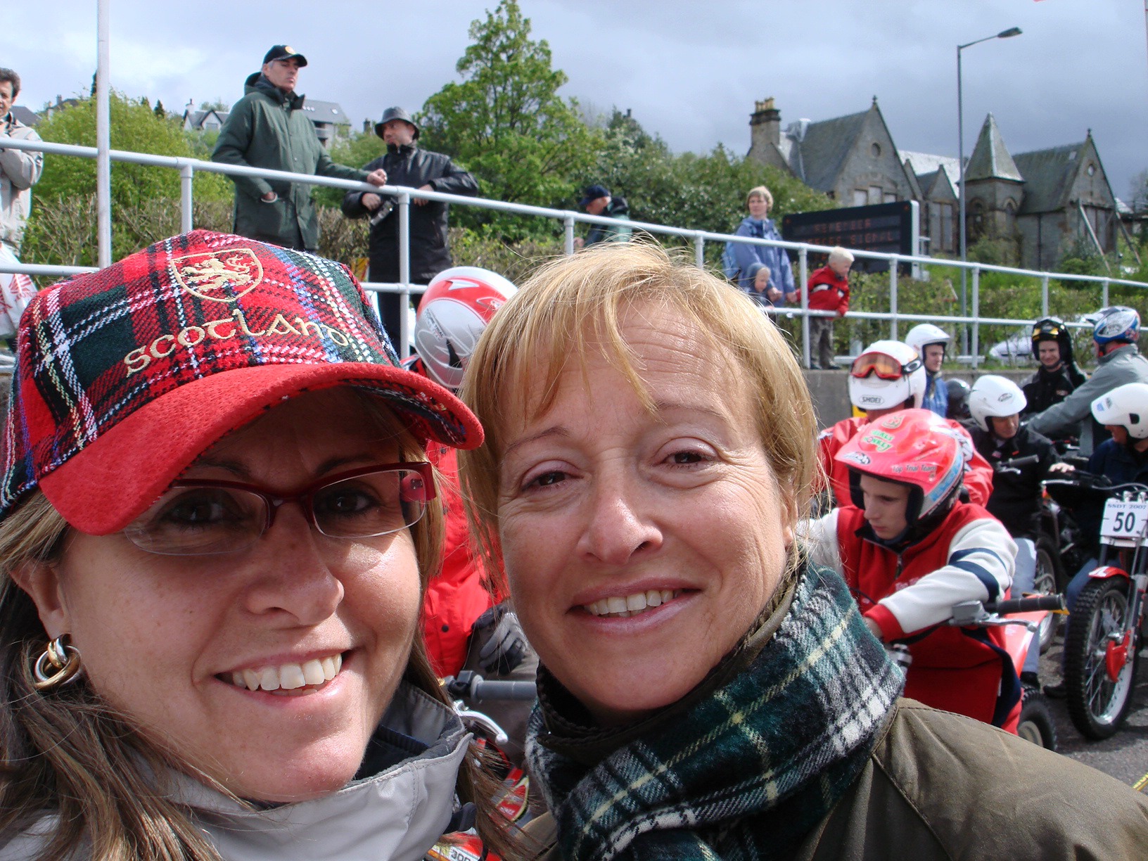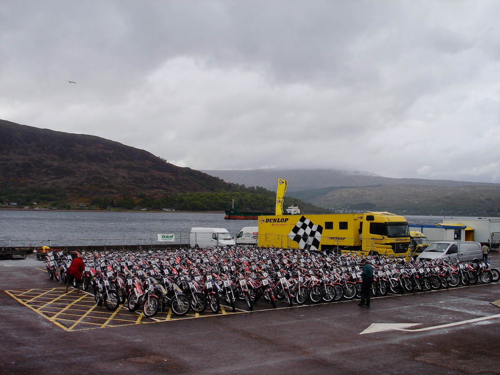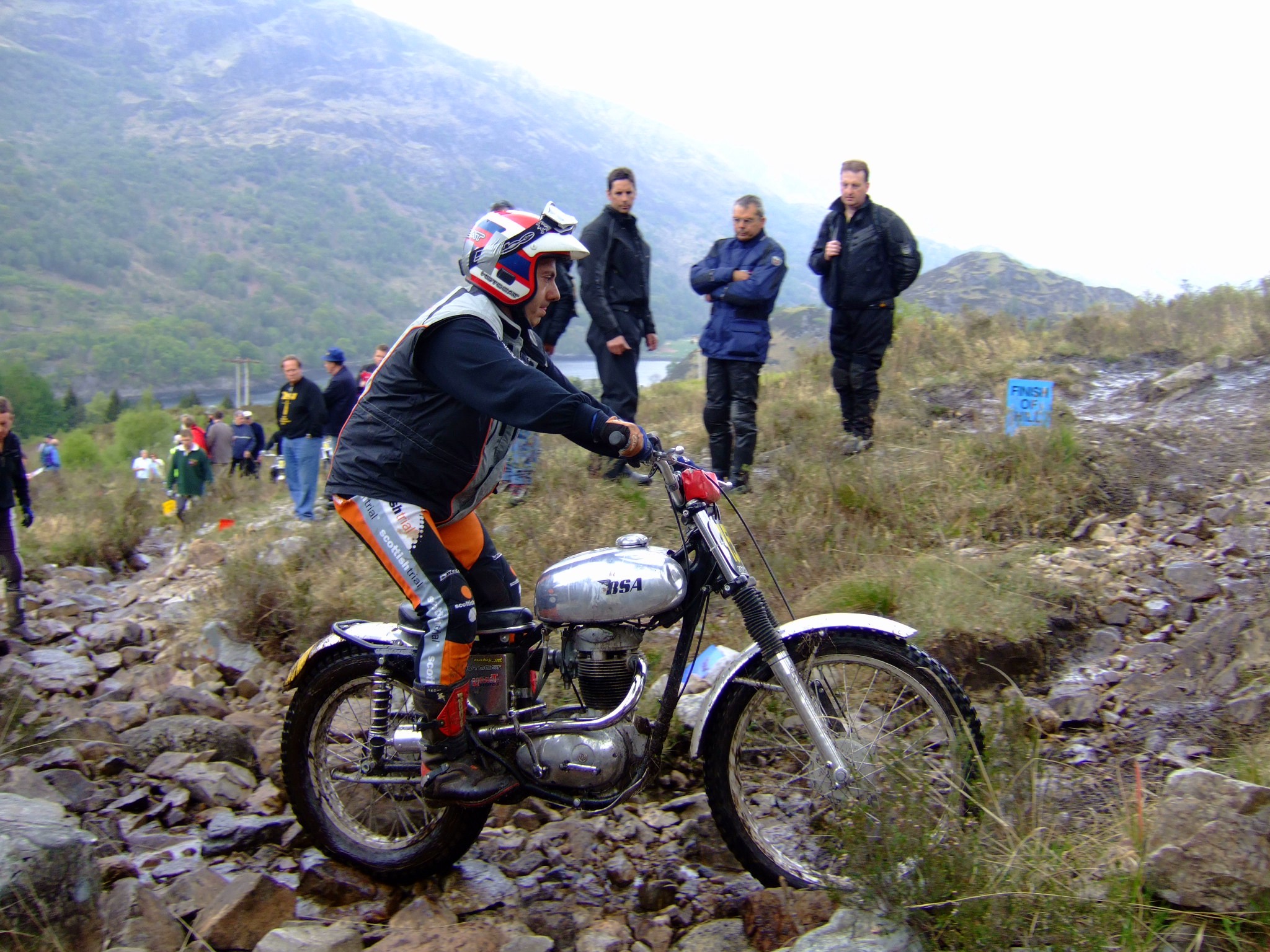 Sobre las 18 horas llegamos a Kinlochleven para formalizar la inscripción de los Pre’65, el grupo mayoritario de españoles ya estaban por allí, abrazos, risas, preparación de motos, más abrazos… conocemos a Ann Gordon, secretaria de la prueba, me da el dorsal y nos comunican que no está permitido seguir el trial. Si hubierais visto la cara de Toni (y no era para menos).